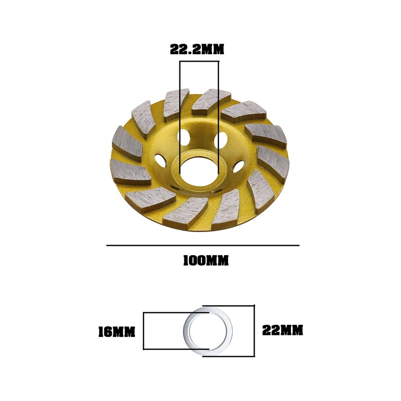 -Size: The diameter of the diamond grinding disc is 100mm, the inner diameter of the diamond grinding disc hole is 22.2mm. The outer diameter of the variable diameter washer is 22mm, and the inner diameter of the variable diameter washer hole is 16mm