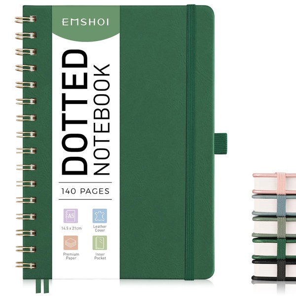 EMSHOI A5 Dotted Notebook, Spiral Notepad, 100gsm, PU HardCover Leather, Stencils, Pocket, Pen Loop, Ruler, Bookmark, 140 Pages Bullet Dot Grid Journal for Women Men Writing, 14.5 x 21cm, Green