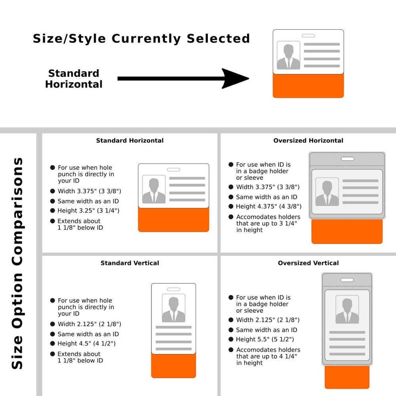 - Available in two sizes – Standard size for when your ID has a hole punched in it and Oversized if you use a badge holder/sleeve.