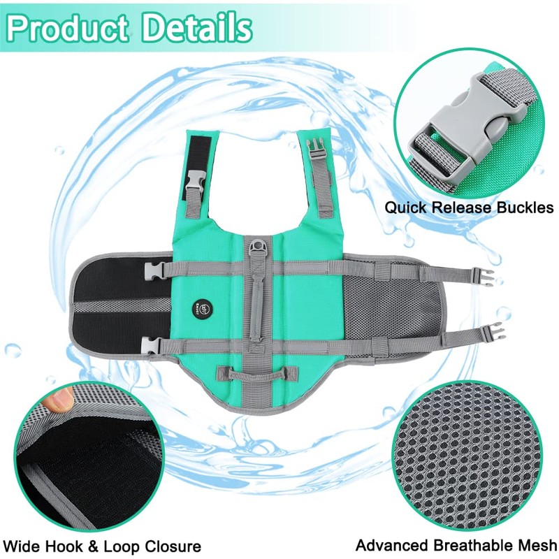 - Perfect Pratical Design: The dog life preserver is designed with adjustable belt and quick-release buckles to make your dog fit comfortably, easy to put on and take off. Handle on top for quick and easy grabbing. The Heavy-duty D-ring Hook is perfect for dog leash. Reflective stripes and bright colors to enhance maximum visibility.