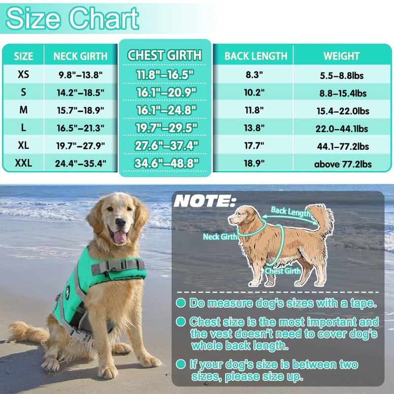 - Sizes Fits Most Dogs: The life jackets for dogs are available for 6 sizes, from XS to 2XL, meet most sized dogs. Please measure your dog twice to get one size and refer to the dimension chart to choose the right size for your dog. Tips: If your dog is between two sizes, we suggest the larger one.