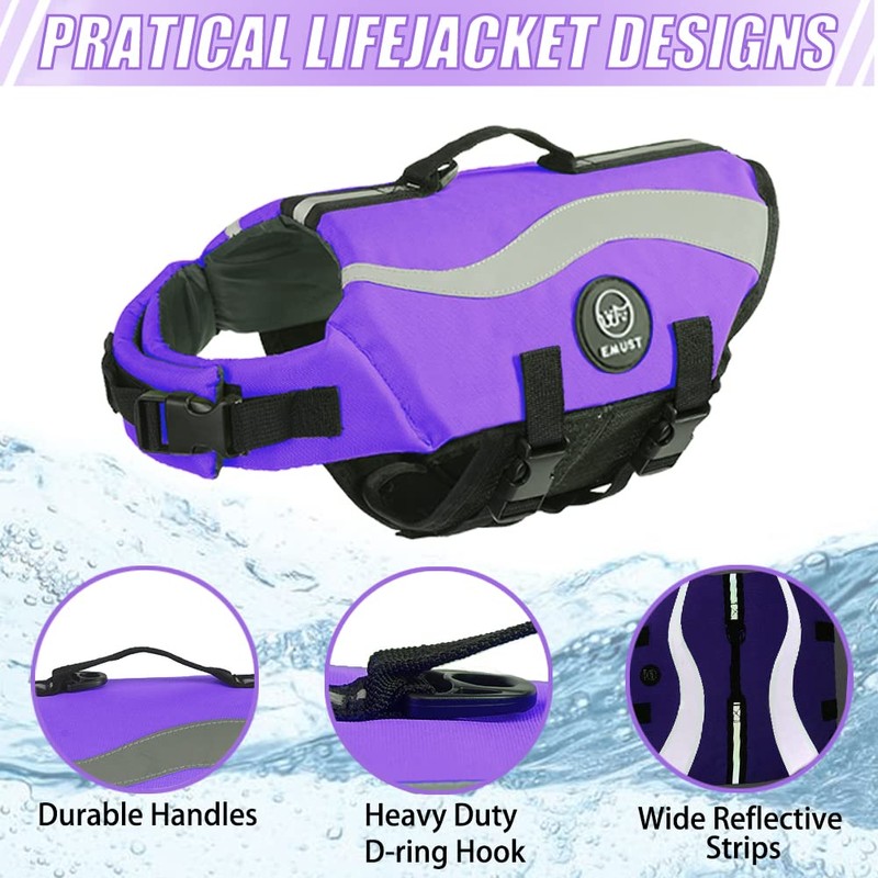 EMUST Dog Flotation Vest, Reflective Life Jacket for Small Dogs with Rescue Handle, Small Dog Vests Lifesaver for Swimming Boating Water with Front Neck Float, Purple,S