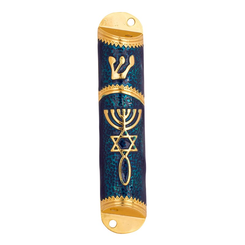 Enamel Door Mezuzah Scroll Case Shedai Jewish (Blue with Gold)