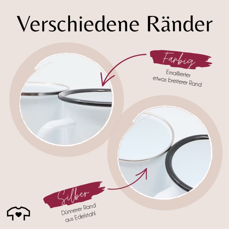 - Real eye-catcher: our enamel mug retro has a white base body with a contrasting edge that offers a modern design. Choose between the blue or black glazed edge or the silver metal edge. Emalli cups are a real eye-catcher on any coffee table and are also perfect as a gift.