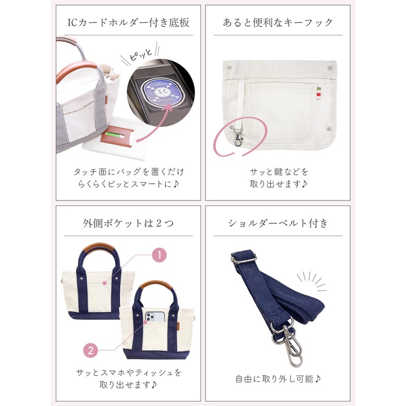 - (An IC card slot on the bottom of the bag) The bottom plate is equipped with an IC card pocket to help the bag stand up on its own, making it easy to pass through the gates just by holding the bottom of the bag to the gate. In addition, we pursue ease of use in a variety of situations, including a convenient key chain and multi-functional pocket