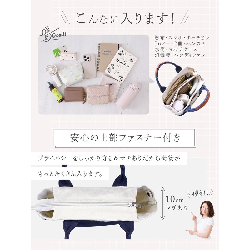 - 3 compartments for outstanding storage. 3 compartments that can be easily removed with the buttons. The large space can store B5 size and can be used for everyday use or commuting. This multi-functional mini tote bag can also be used as a lunch bag with a wide gusset construction that can hold a long wallet, etc. Size (H x W x D): Approx. 8.3 x 9.1 x 5.9 inches (21 x 23 x 15 cm); Weight: Approx. 12.2 oz (360 g) (excluding bottom plate and partitions)