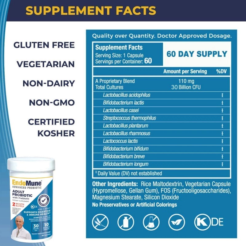 Endomune Adult Multi-Strain Probiotic Supplement 30 Billion CFU 60 Count
