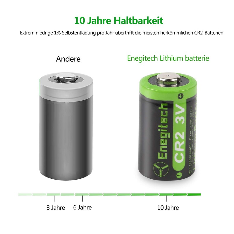 - 【Enegitech CR2 Lithium Battery】Voltage: 3V, Capacity: 800 mAh, Longer shelf life- 10 years. It is Non-rechargeable and lasts 3-5 times longer than alkaline batteries. Make your high drain devices (such as digital cameras) work longer and record more.