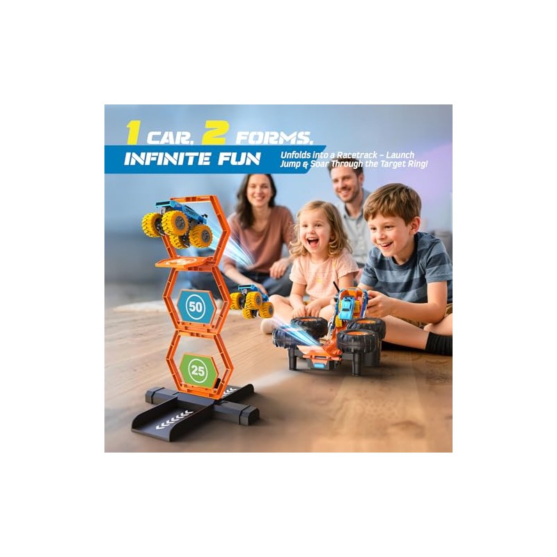 - -- C - + One click transforms the rc cars into an exciting track launcher. Kids can blast mini cars at adjustable angles (30/45/50), aiming for the scoring gate (25/50/100 points). Every launch sparks cheers whether they're racing solo or with friends. The foldable track makes storage and travel simple, turning any room or backyard into a stunt arena. A thrilling twist that normal rc trucks can't offer