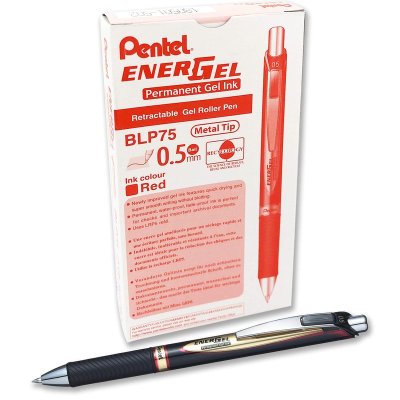 EnerGel Permanent Retractable Rollerball, 0.5mm, Red Ink, 1 Pack of 12 pens