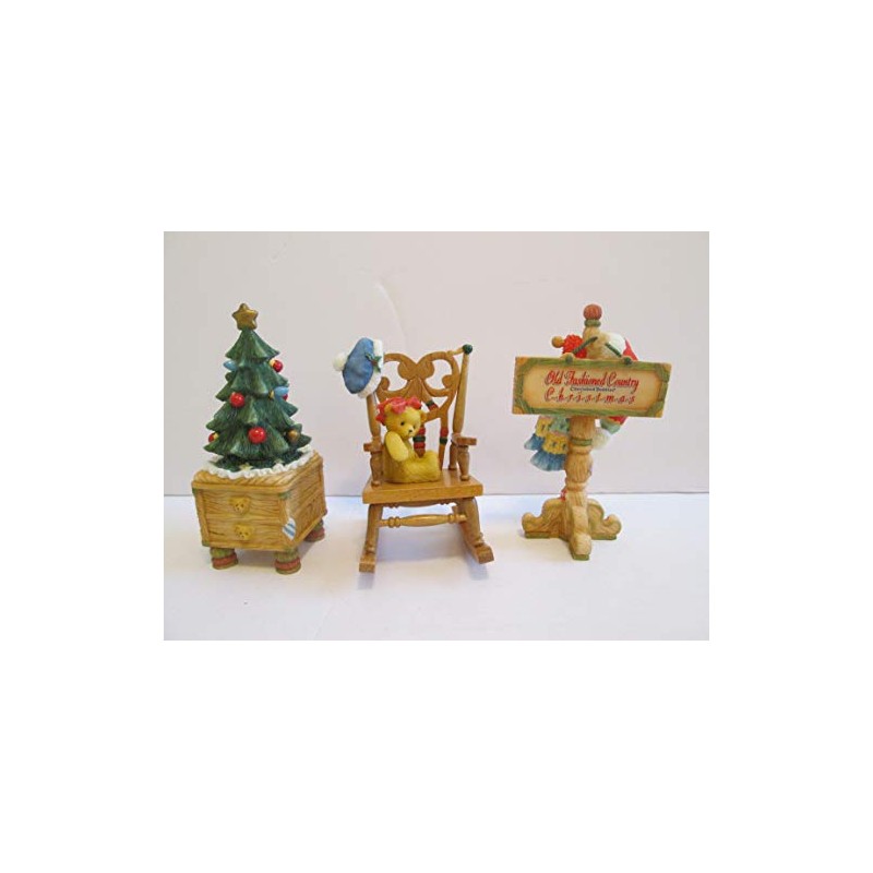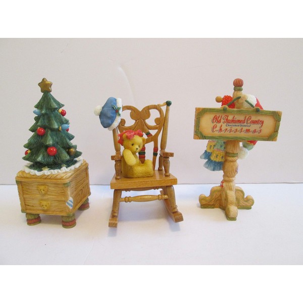 - Cherished Teddies Bear in a rocker, Christmas tree and and holiday sign
