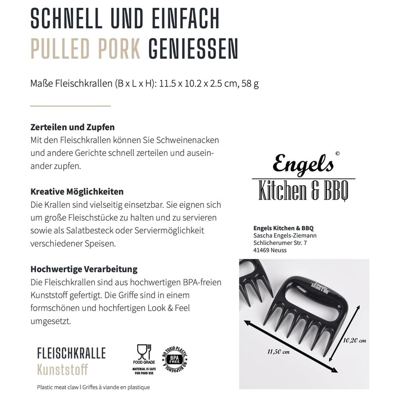 - ✅ QUICK & EASY - Produced & made from high quality plastic. Compared to other plastic meat claws, the premium meat claws / meat forks from Engels - Kitchen & BBQ are even more dimensionally stable, solid and resistant to food acids. They are mainly odourless and tasteless.