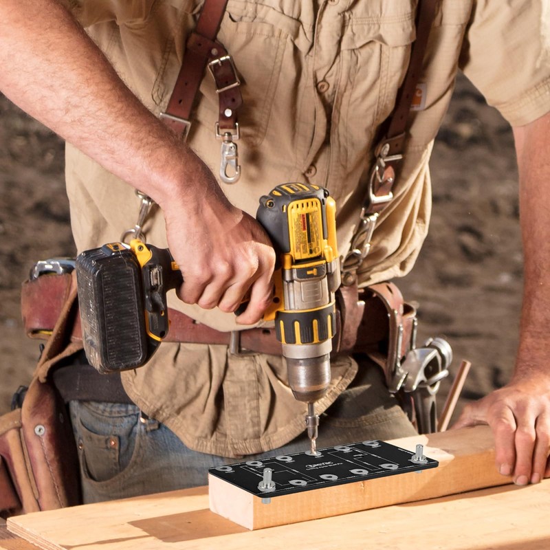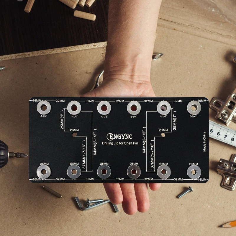 - Work Faster and Professional: ENGYNC metal cabinet jig provides stable and precision drill performance. The shelf pin drill guide for shelf pins can drill 6pcs 1/4 Inch and 6pcs 5mm straight holes one time at 1-1/4 Inch distance for shelves building. All metal door hinge jig make your job faster and save time