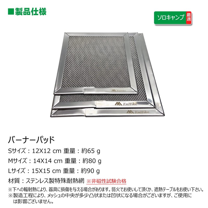 - [Twill 18-8 Stainless Steel (SUS304) Mesh] Twill weave 18-8 stainless steel (SUS304) mesh provides even flame burn and disperses heat. Compared to regular plain woven wire mesh, the diameter of the wire is thicker and denser and the strength of the wire mesh can be used for longer. Size S: Approx. 4.7 x 4.7 inches (120 x 120 mm); Weight: Approx. 2.4 oz (65 g); Size L: Approx. 5.9 x 5.9 inches (150 x 150 mm); Size L: Approx. 5.9 x 5.9 inches (90 g); Material (Non-magnetic test passed): Frame: 304 stainless steel, mesh: special heat resistant steel