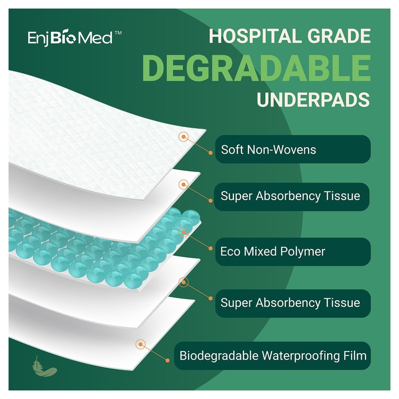 - HOSPITAL GRADE PROTECTION YOU CAN TRUST-EnjBioMed disposable underpads strictly adhere to hospital grade standards and are suitable for various high-demand settings such as hospitals, postpartum care, and elderly care, delivering professional and reliable protection you can trust.