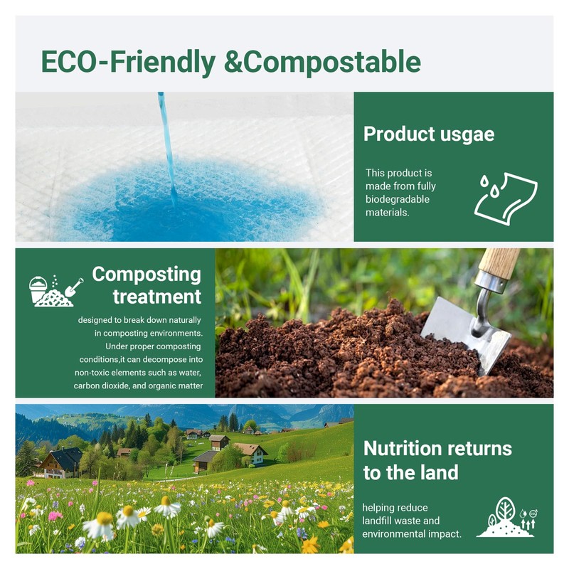 - ECO-FRIENDLY&COMPOSTABLE -EnjBioMed disposable underpads are made from biodegradable, eco-friendly materials that naturally break down into water and carbon dioxide within 3 to 6 months, effectively reducing environmental impact and protecting both your health and the planet.