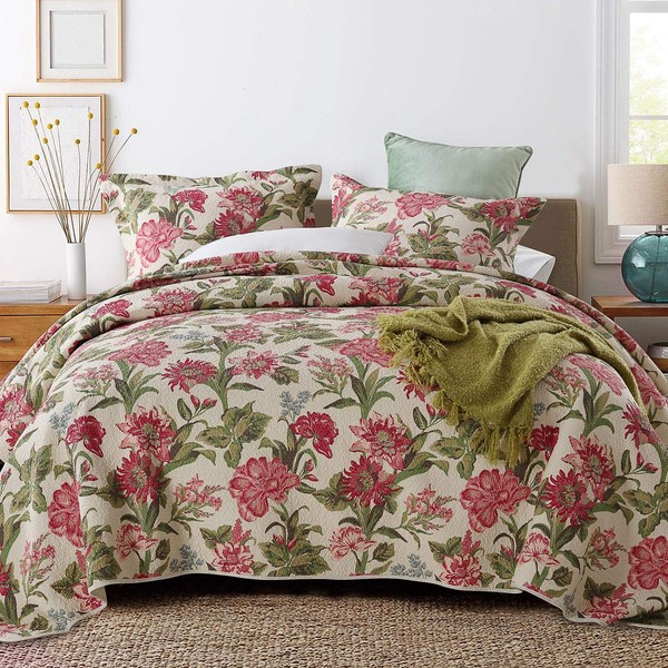 ENJOHOS Queen Size 3 Piece Quilt Set Reversible Fabric Bed Coverlet with Red Flower Green Leaves Prints 100% Cotton Quilted Bedspread Bedding Sets for Queen Beds