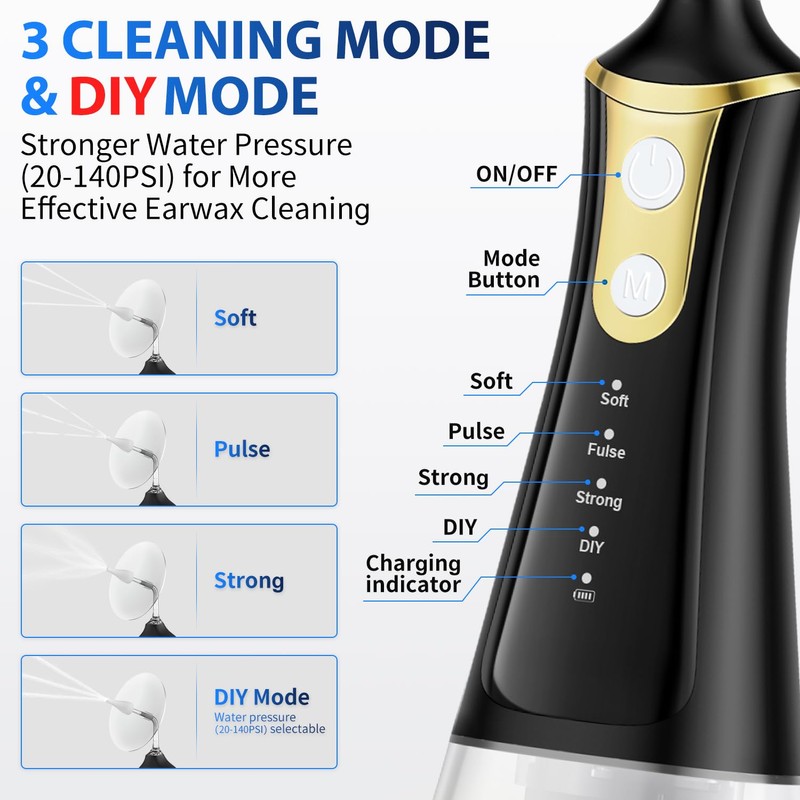 - đŠăFour Cleaning Pressure ModesăEar irrigation flushing system has 4 cleaning modes (Soft, Pulse, Strong, DIY), Just one button to switch and select the mode you need. DIY mode can freely select the water pressure from 20-140PSI, you can use earwax removal kit to customize the most comfortable water pressure.