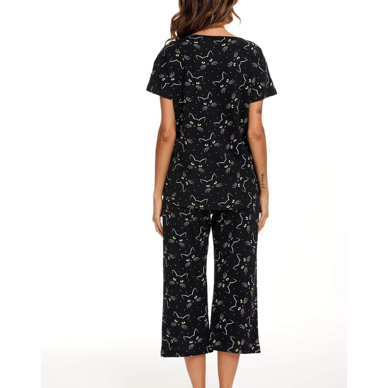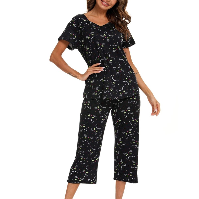 - Two-Piece Pajama Set: Cute v-neck printed pajamas, paired with capri sleepwear pants, elastic waist, loose and comfortable nightgwear for you to have a comfortable sleep