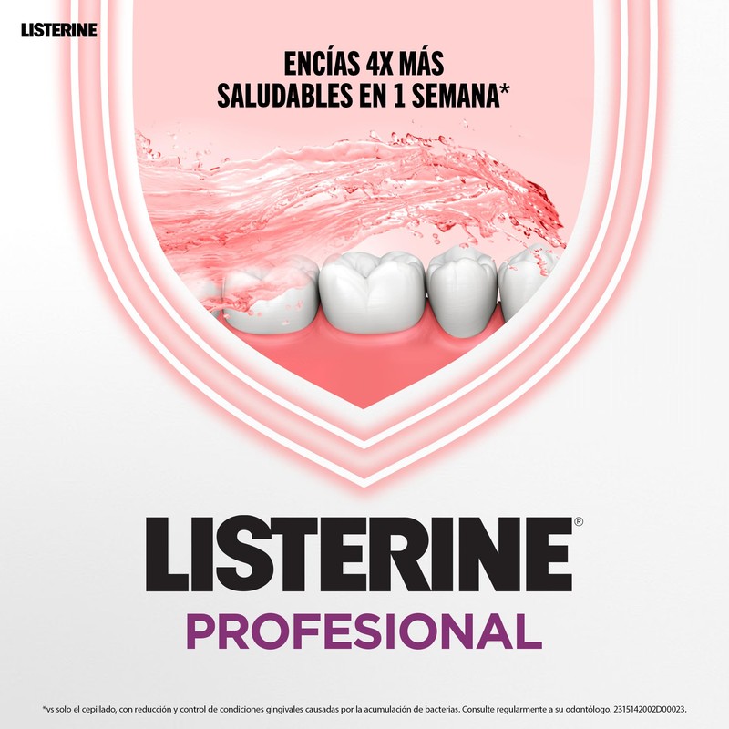 - LISTERINE PROFESIONAL EXPERTO EN ENCÍAS es la fórmula más avanzada de nuestro portafolio. Con máxima concentración de Zinc, combate las condiciones de encías y sus efectos a partir de 1 semana de uso. Su fórmula única con 4 aceites esenciales es segura y puede ser de uso diario.