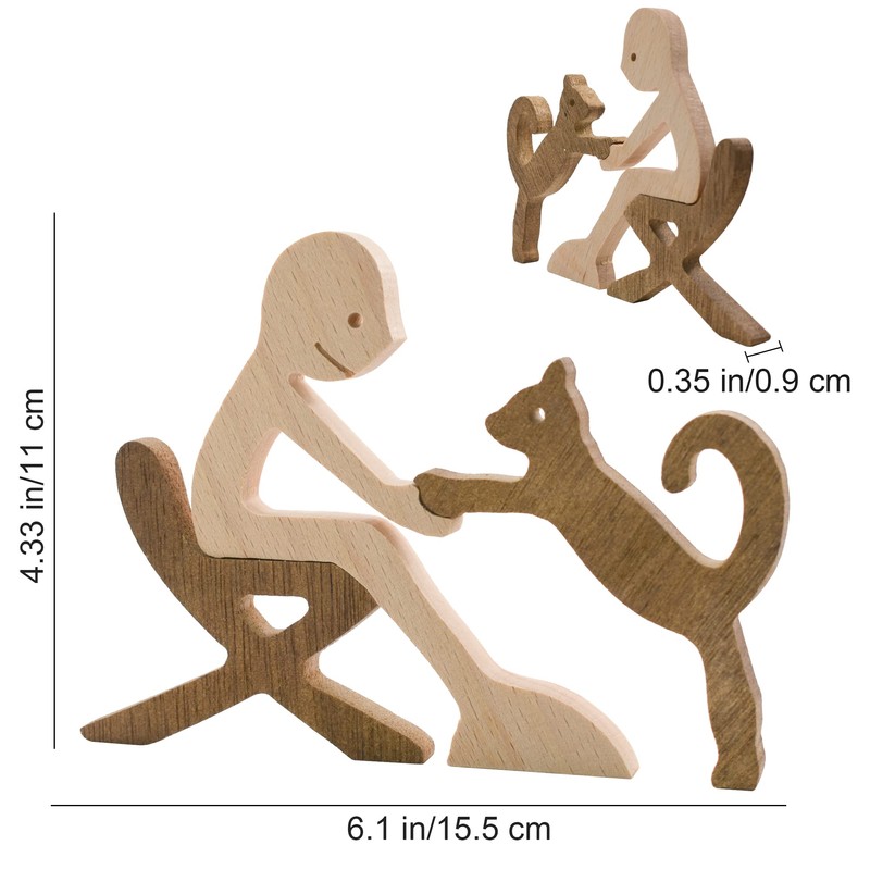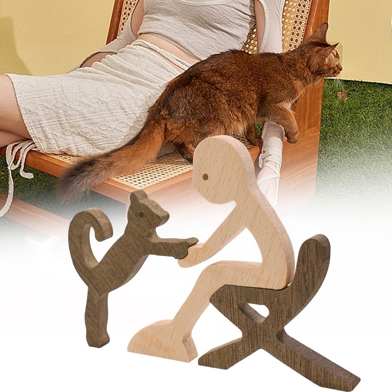 Enkrio 子犬 木製彫刻 ウッド装飾 手彫り 家族 木製の工芸品の彫刻 オーナメント ペット愛好家 記念ギフト かわいい 卓上装飾品 置物 男性 (猫と男性)