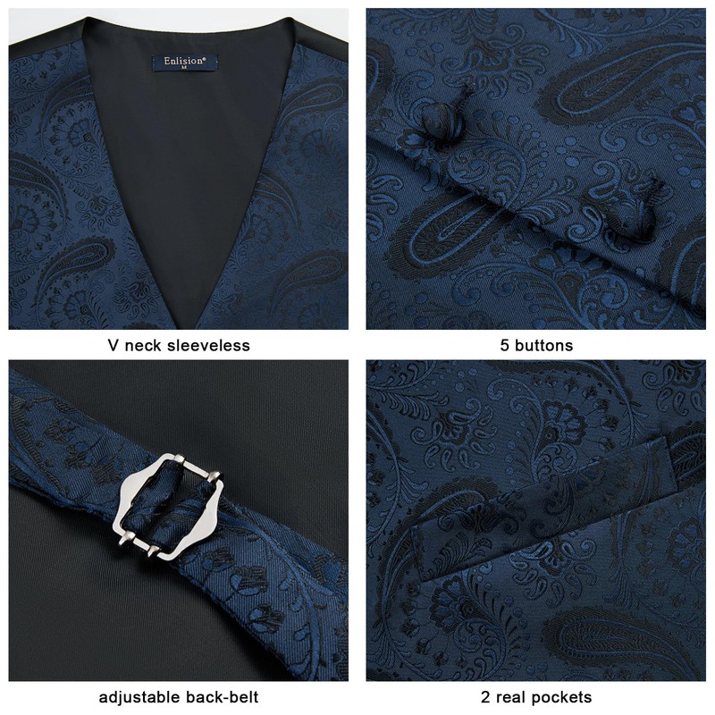 Enlision Men's Waistcoat Paisley Waistcoat Tie Pocket Square Set for Wedding Party Business XS - 6XL, navy