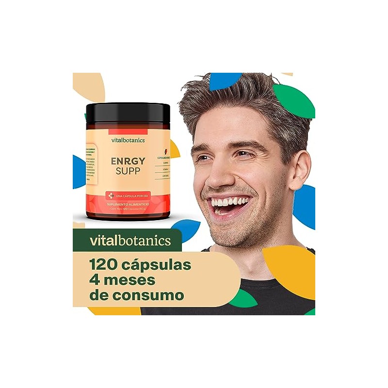 ENRGY SUP Guarana, Cafe Verde y Vitamina C. Con 120 capsulas de 500mg (4 meses). VitalBotanics. Suplementos Alimenticios. Multivitaminico Hombre y Mujer. Libre de Gluten y Aditivos.
