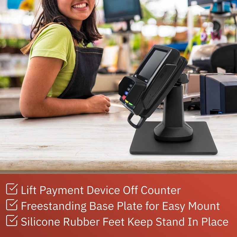 - Freestanding 8'' x 8'' base plate with silicone rubber feet prevents slippage and allows for merchant flexibility; secure your terminal without having to go through the hassle of mounting it to your countertop; protect device without any damage to countertop
