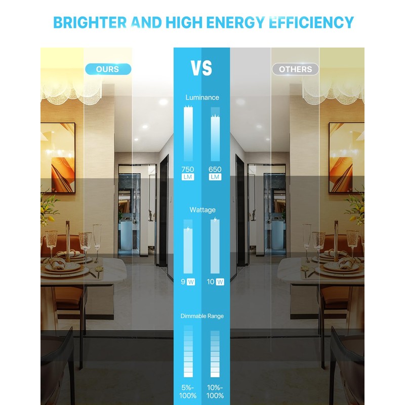 - 💡【High Brightness】The 6-inch slim lights use the new generation of LED chips with higher lumens and lower power. 750LM consumes 9 Watts, which equals to 750W incandescent lamp, saving you up to 88% in energy costs. Frosted LED lens for anti-glare and scratch-resistant.