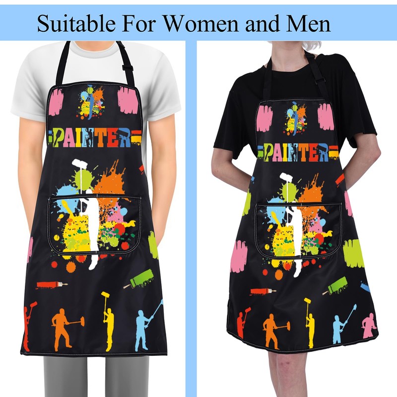 - ONE SIZE FITS MOST: Funny painter themed apron is 28.7 inches (73 cm) in length and about 26.7 inches (68 cm) in width, It can cover adults from chest to knee and provides great coverage. A long waist strap and an adjustable neck strap fit most people.