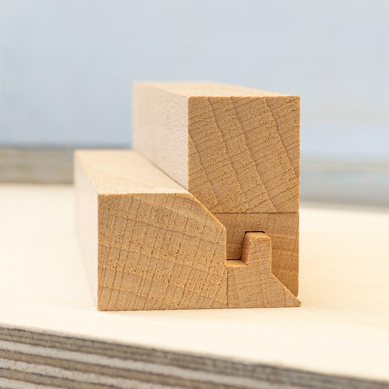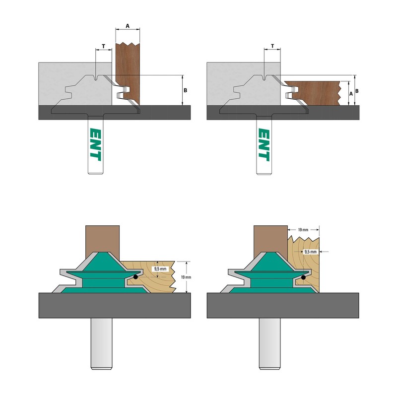 For stable gluing of two work pieces at a 90 degree angle. Straight gluing is also possible. With the help of the included adjustment template, the cutter can be quickly and easily aligned in height and depth, so that the horizontal and vertical milling fit into each other form-fitting.