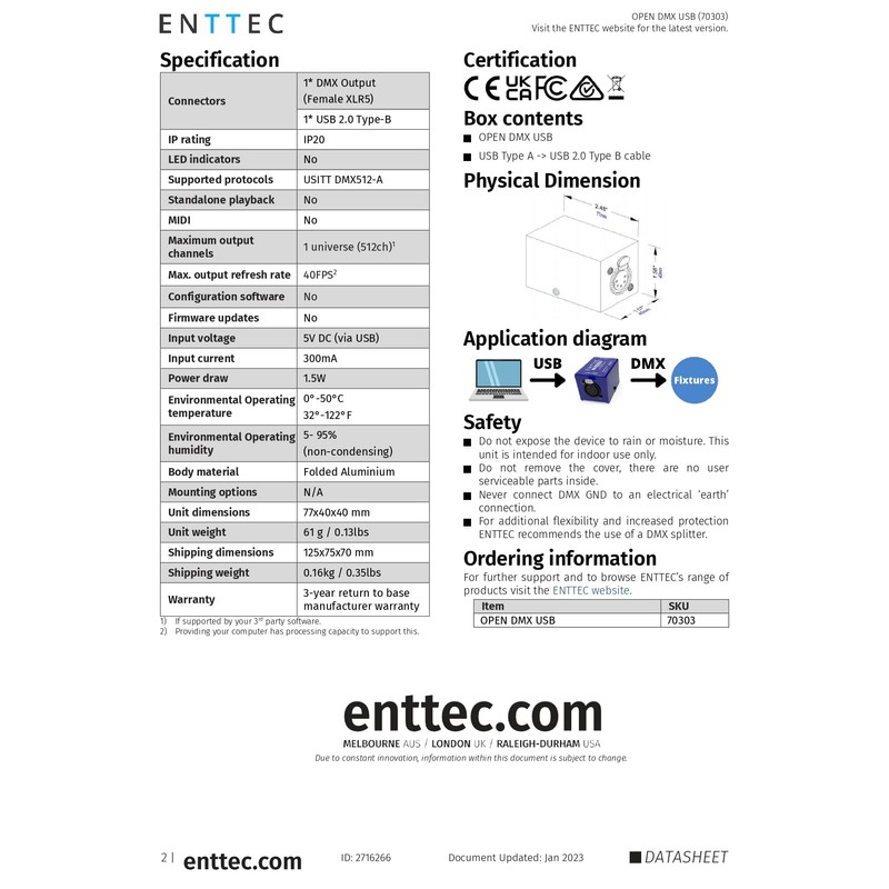 Enttec Open DMX USB 70303 Lighting Interface - Open Source/Hardware Only - Entry Level Model