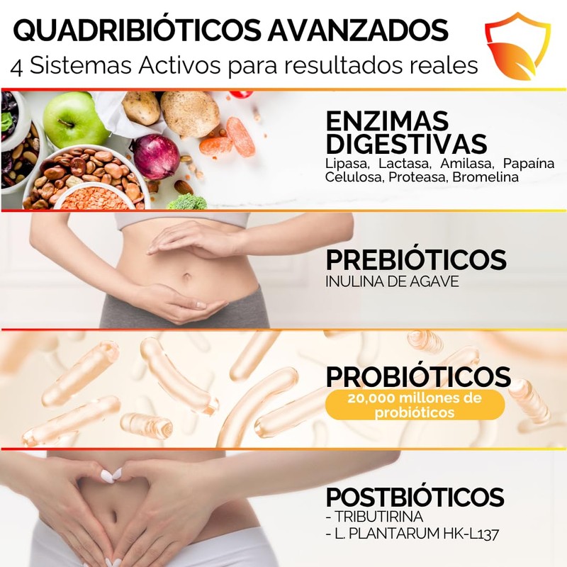 - 🌿 FÓRMULA AVANZADA 4 EN 1: QUADRUPLE ESPECTRO que combina 7 ENZIMAS DIGESTIVAS, Prebióticos (Inulina de Agave, FOS), Probióticos y Postbióticos activos para una fórmula integral.