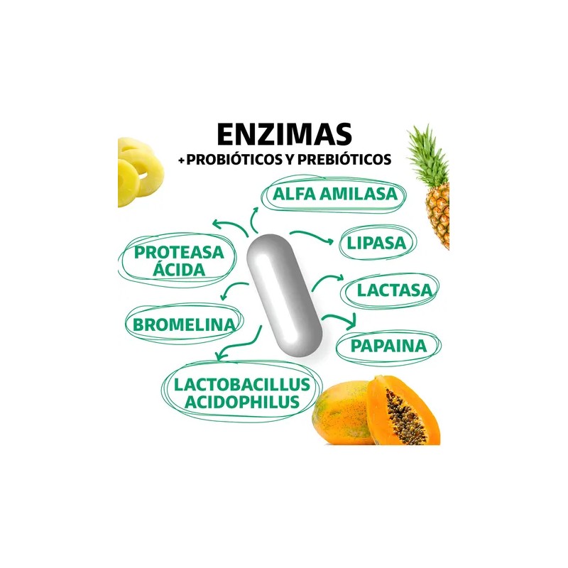 Enzimas digestivas: Proteasa ácida, alfa amilasa, lactasa, celulasa, lipasa, bromelina y papaína, que ayudan a descomponer proteínas, carbohidratos, grasas y fibra.