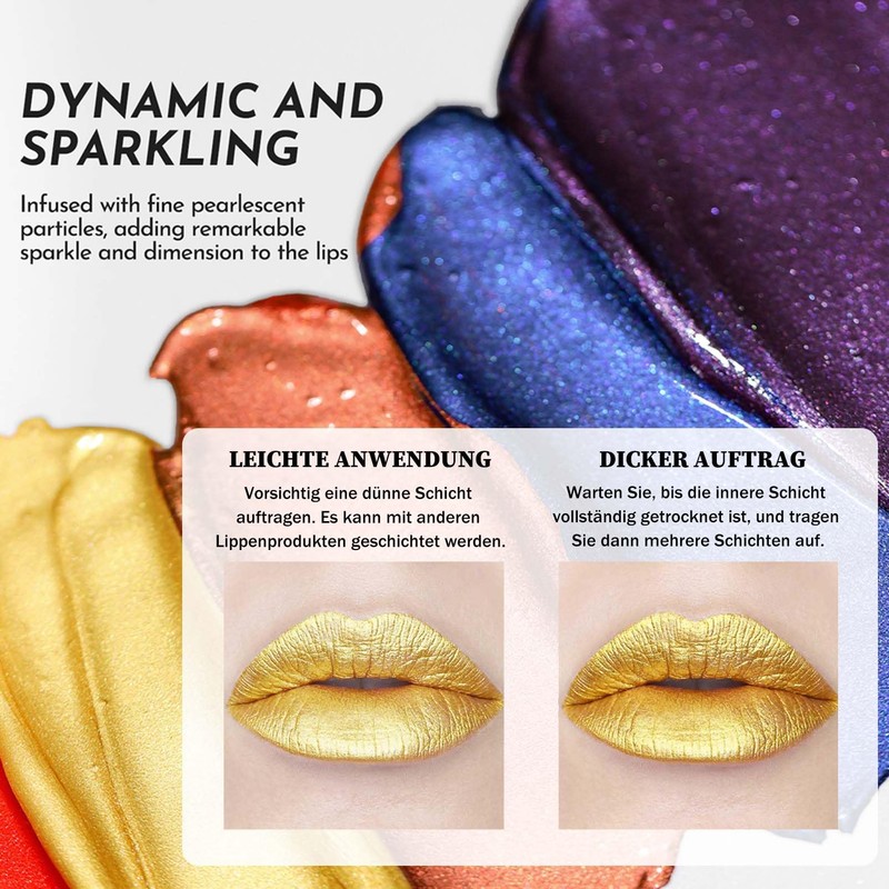 - 【Hochpigmentierte Farbe】lippenstift gold metallic sind hochpigmentiert und liquid lipstick decken die Lippenfarbe vollständig ab, so dass Ihre Lippen unglaublich intensive Metallic-Töne und einen herrlichen Glanz erhalten. Erzielen Sie in nur einem Schritt einen voluminösen Lippen-Look.
