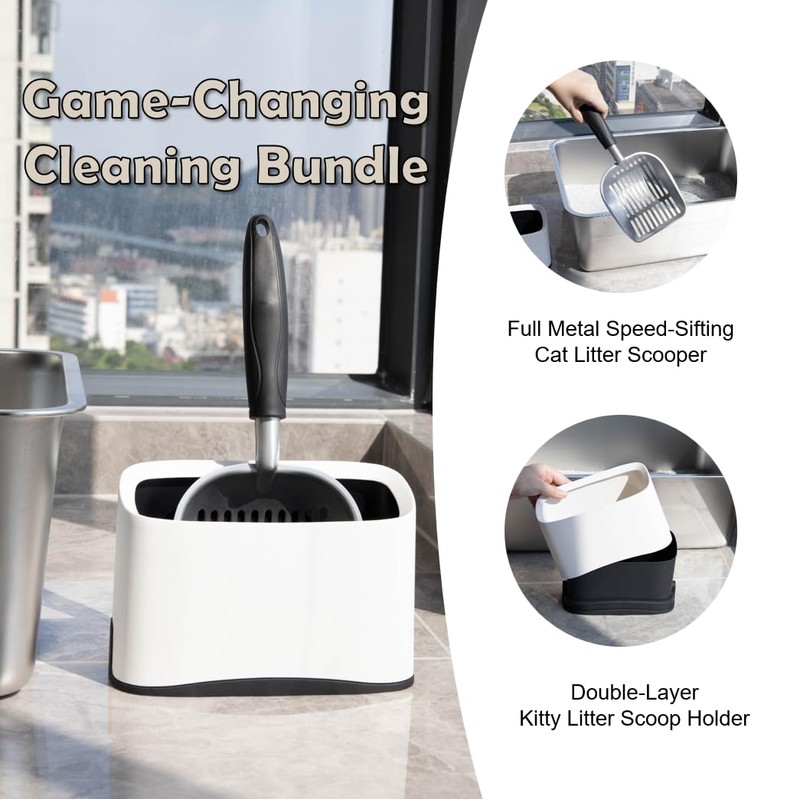 - Cat Litter Scooper with Holder – Scooper comes equipped with a convenient stand, a must-have for maintaining a clean and healthy home environment. The included stand is a great addition. It is so much sanitary than resting a scoop nearby the litter pans