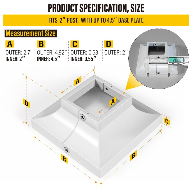 - Tamaño: Especificaciones: adecuado para tamaño de poste de 2 x 2 pulgadas, tamaño de la base de 4.5 x 4.5 pulgadas, Cantidad: 2 unidades