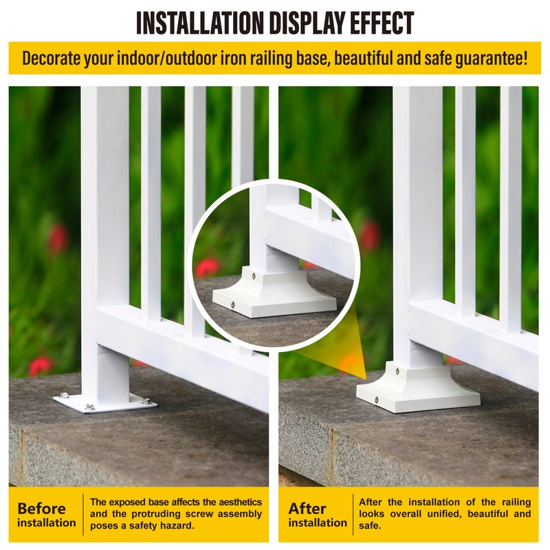 - Construido para durar: nuestras cubiertas de base de poste de cubierta están hechas de aluminio fundido a presión ADC-12. No se deforman, se oxidan ni se agrietan. Actualiza fácilmente tus pies de posición, no necesita soldadura ni remodelación. Estas fundas ocultan anclajes expuestos y defectos de construcción, dando a tus barandillas y pasamanos de entrada de hierro un aspecto limpio y pulido.