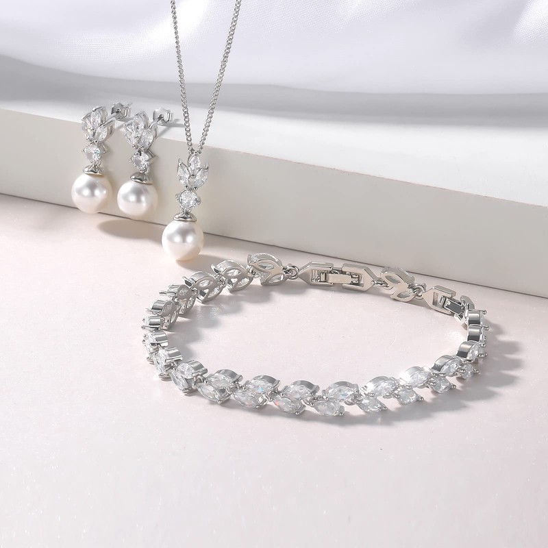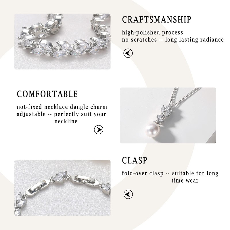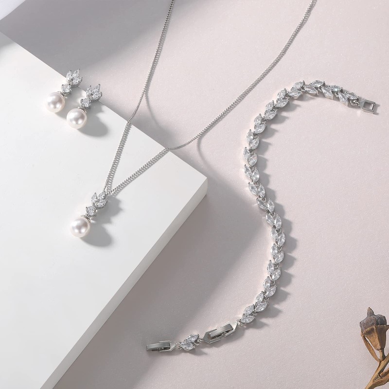 - đź‘°Premium Quality Jewelry Setđź‘°Package including 1 piece of necklace, 1 pair of earrings and 1 piece of bracelet. Adorned with selective zircon stones, crafted in eco-friendly 14K white gold, lead-free and nickel-free, this dainty jewelry set is born to match your gorgeous beauty.