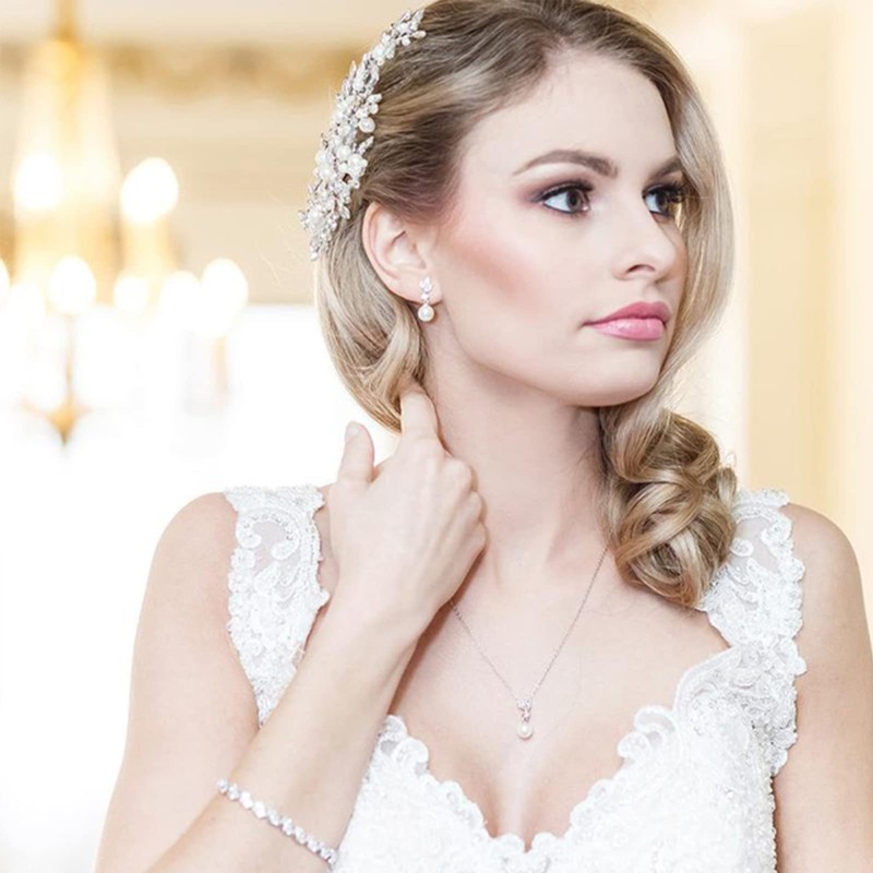 EPIRORA Wedding Jewellery for Bride - Sterling Silver Pearl Earrings Bracelet Necklace Set Costume Prom Jewellery for Bridal Bridesmaid with Cubic Zirconia, Pack of 3