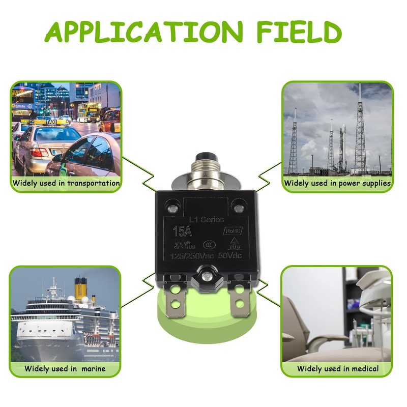 - Product Name: Manual Reset Push Button Switch Thermal Circuit Breaker; Rated Voltage DC50V, AC125-250V; Rated Current: 15A
