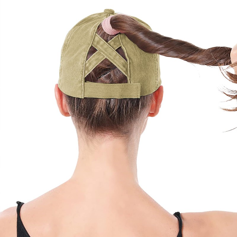 - CrissCross Design: Our ponytail baseball cap is designed with newest criss cross band in the back of the cap, which is specially made to pull your long hair through. Really gives you options, whether you wear it with a high ponytail, briad, messy bun, or wear it with your hair down and it still looks good. A must have for people with long hair, while showing a sense of unique fashion to others.