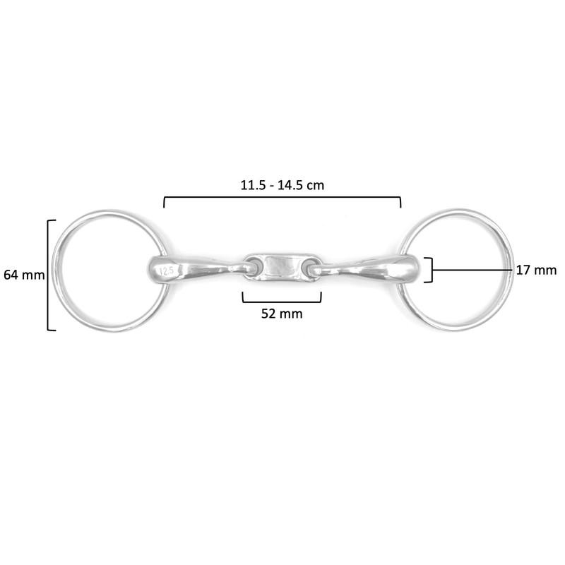 ErgoBit Dr. Bristol double jointed anatomically shaped, mouth friendly, stainless steel, ring diameter 65 mm, bit thickness 16 mm - The double-jointed mouthpiece ensures even pressure distribution and precise reins. The anatomical shape adapts to the horse's mouth structure, which increases comfort. With a bit thickness of 16 mm and a ring diameter of 65 mm, it provides gentle control. Made of high quality stainless steel for durability and resilience. Ideal for effective and mouth-friendly reins guidance.