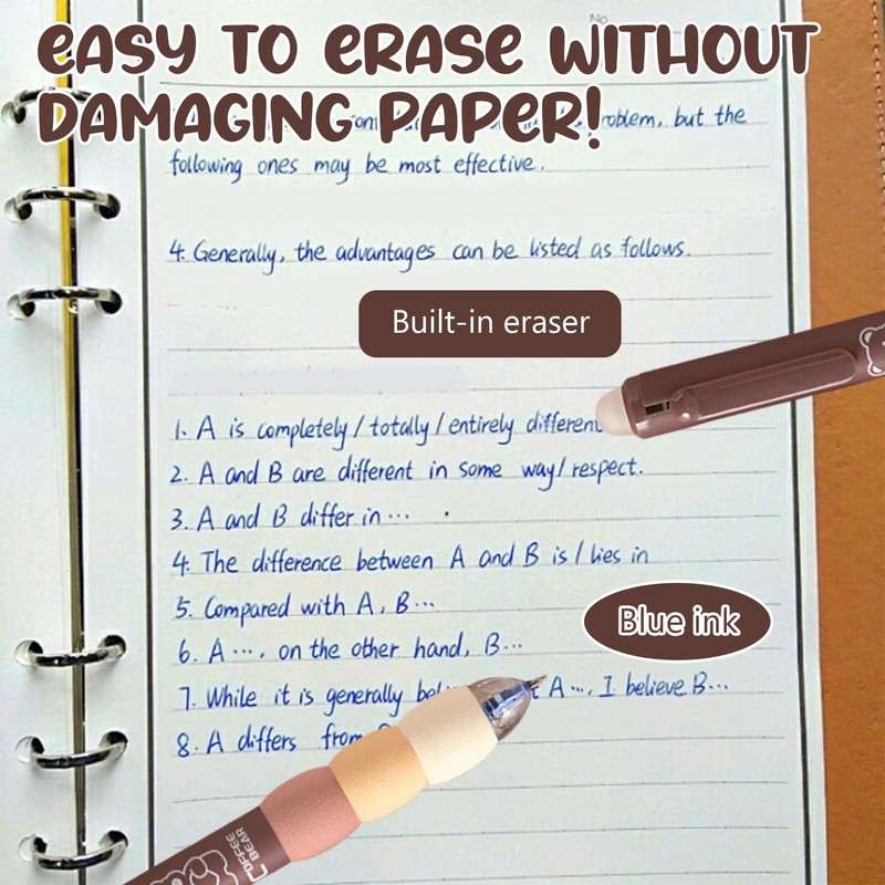 🧸4 Pcs 0.5mm erasable gel pens, with a delicate and cute little bear as the design style center. With these cute erasable pens, you can correct mistakes and rewrite without wearing out the paper.