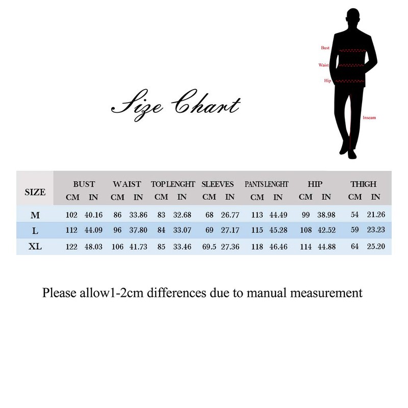 * XL Chest:48.03"/122cm, Waist:41.73"/106cm, Sleeve:27.36"/69.5cm, Length:33.46"/85cm, Hip:44.88"/114cm, Thigh:25.20"/64cm, Pants Length:46.46"/118cm