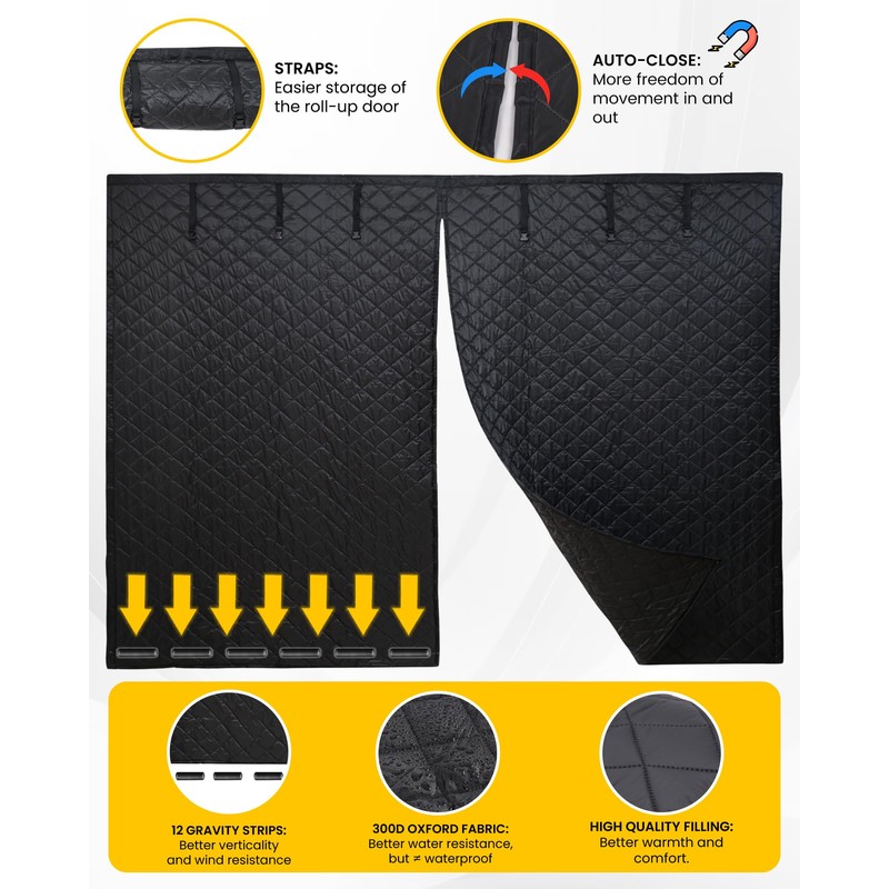 - Effortless Installation: We’ve designed a Velcro fastening system that eliminates the need for complex installation steps, allowing you to complete the setup without professional tools. Additionally, the curtain features a weighted bottom that ensures a close fit to the ground, effectively blocking out cold drafts and improving the seal, so you can enjoy instant warmth and protection once installed.