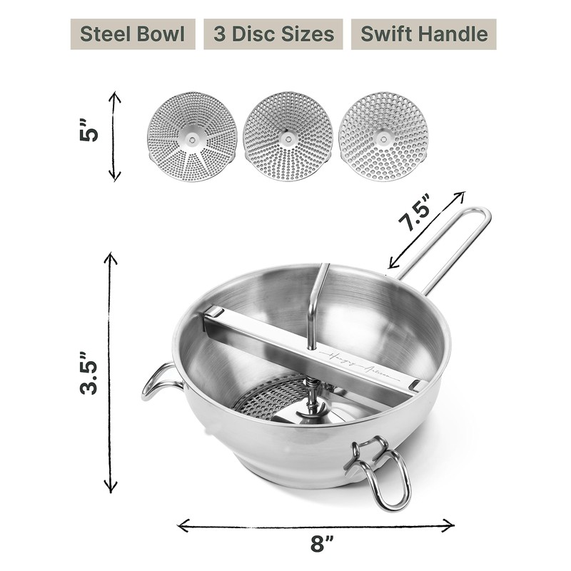 - WON'T CLOG YOUR PANTRY OR CABINETS: Measuring a very manageable 8 x 3.5 inches with a 7.5 inch handle, this steel food mill won’t take up a lot of storage space; You can tuck away all of the pieces neatly in your pantry, cabinet, or kitchen drawers with room to spare