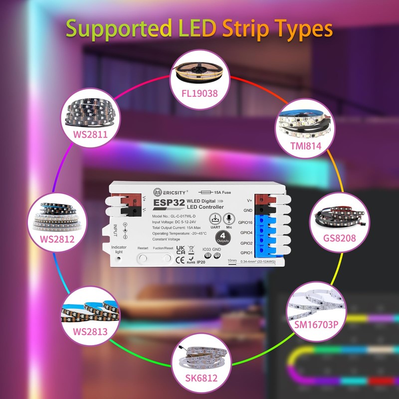 - Multiple Light Strip Compatibility : Chipsets automatically configure through WLED software. The controller have super compatibility and can be perfectly matched with various addressable light strips like WS2805, WS2811, WS2811F, WS2812B, WS2814A, WS2815, SK6812, SM16703, SM16703SP3, FL19038, FW1935, UCS2903B, You can freely connect all kinds of DIY devices, fully stimulating your creative potential and expanding unlimited possibilities