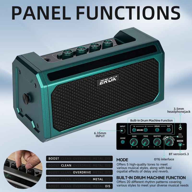 EROK Mini Guitar Amp with BT/OTG - 20 Drum Beats,5 Effects (Clean/Boost/OD/Dist/Metal),Reverb+Delay,Battery Powered Portable Amp for Practice/Travel(TG-08,Green)