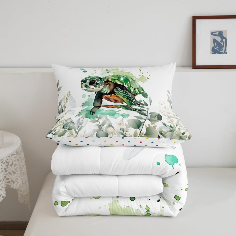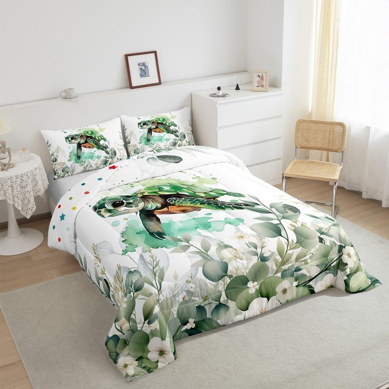 Erosebridal Cute Sea Turtle Full Bedding Sets for Kids Child Green Eucalyptus Comforter Set, Marine Animal Down Comforter Botanical Plant Leaves Bedding Comforter Sets, Cartoon Wildlife Duvet Insert